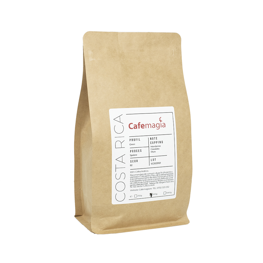 Cafemagia Costa Rica Tarrazu Proaspat Prajita este ambalată într-un pachet de 500 grame, cu un aspect atractiv și etichetă informativă. Pachetul asigură siguranța și prospețimea boabelor de cafea înainte de deschiderea acestuia.